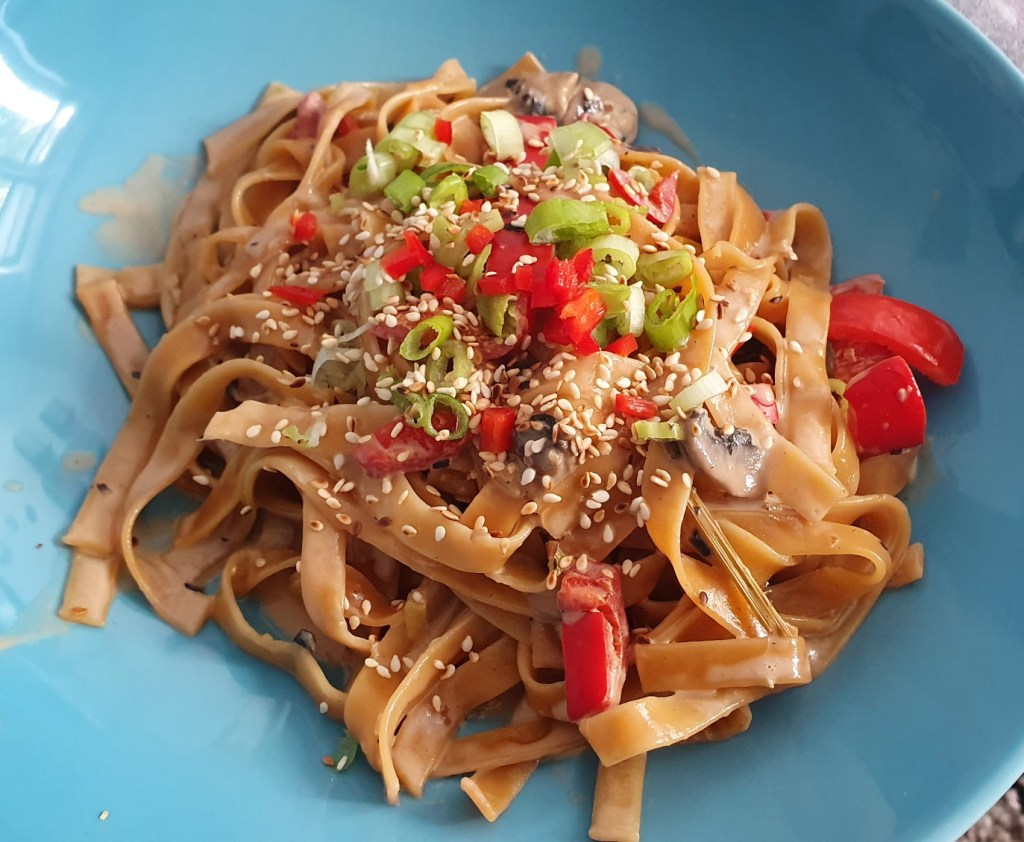 - Asia noodles with lemongrass, mushrooms and peppers in coconut milk sauce – definitely one of our favourites so far and enough to last for days